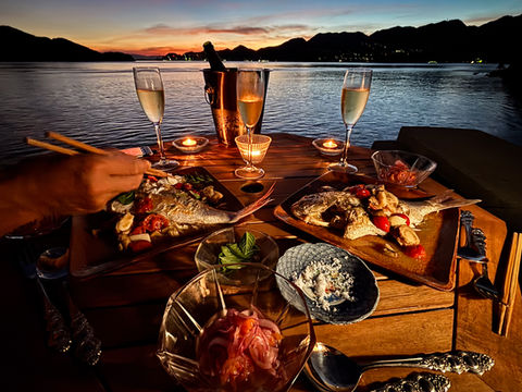 島の恵みを愉しむフリーキッチン。自然のままの味をそのまま に。畑での収穫や作り手の思いを感じながら、広いキッチンで自由に調理いただけます。心も体も満たされる特別な体験をお楽しみください。地元食材を使った和食御膳や京料理のご予約も承ります。